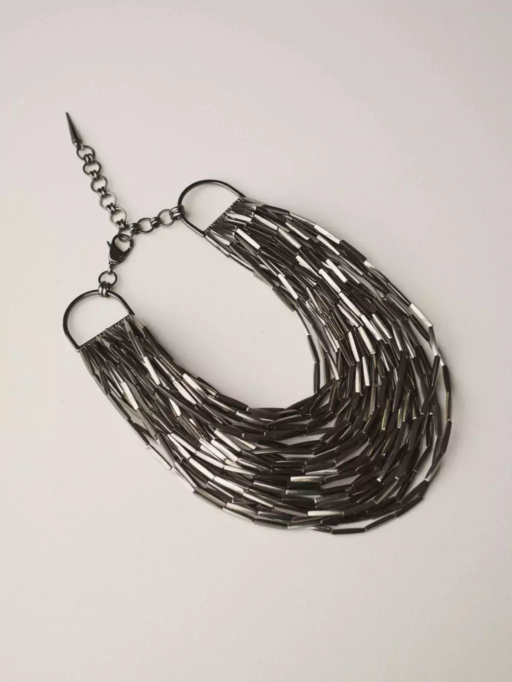 É uma peça leve, com várias voltas, acabamento de metal e fechamento ajustável, podendo ser usado mais curto ou mais longo. Faz parte da Coleção Ícones.