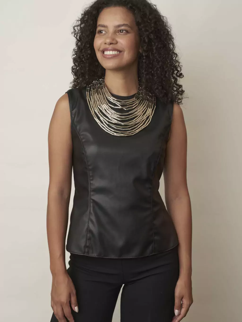 É um colar leve, com várias voltas, acabamento de metal e fechamento ajustável, podendo ser usado mais curto ou mais longo. Faz parte da Coleção Ícones.
