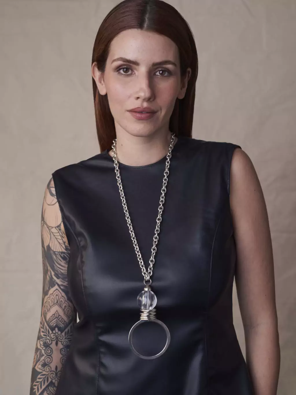 As peças da Coleção Três trazem linhas longínquas e contínuas. Os colares podem ter comprimento curto, médio ou longo, em tom ouro velho, grafite ou prata.