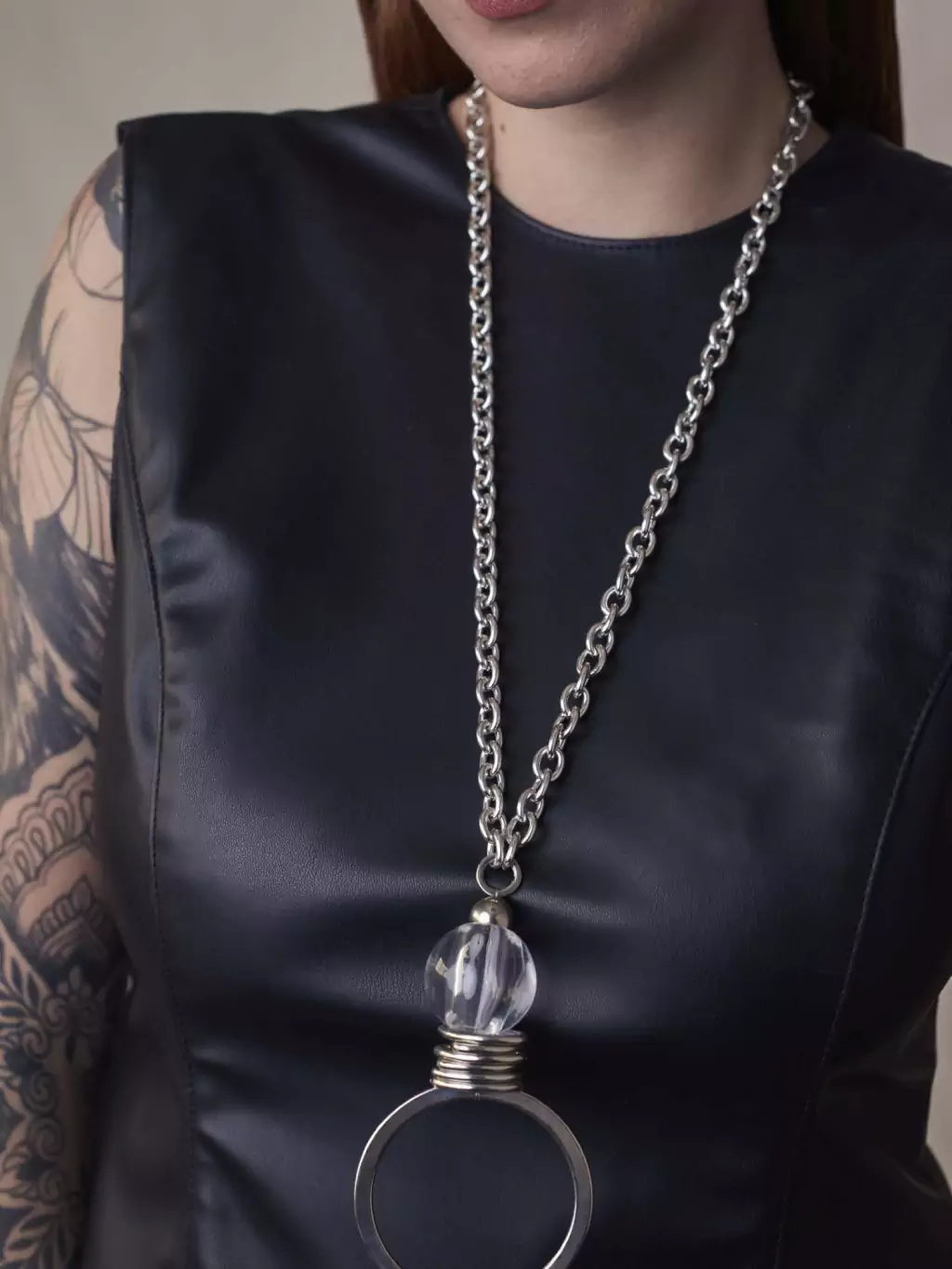 O colar Fio Nave é feito de corrente de alumínio prata e bola de resina com argola de metal.